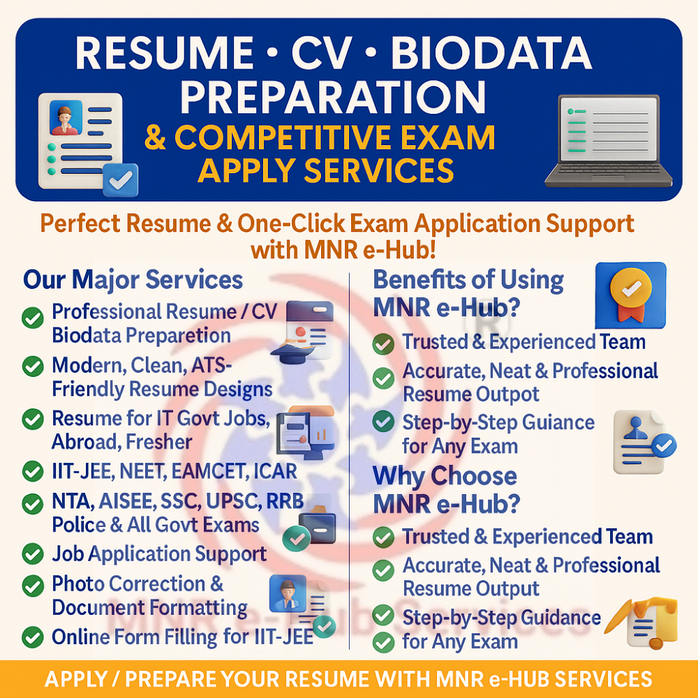 MNR e-Hub Services offers professional Resume, CV, and Biodata Preparation, along with complete support for competitive exam applications like IIT-JEE, NEET, EAMCET, ICAR, NTA, AISEE, SSC, UPSC, RRB, Police Jobs, State Govt Exams, and more.