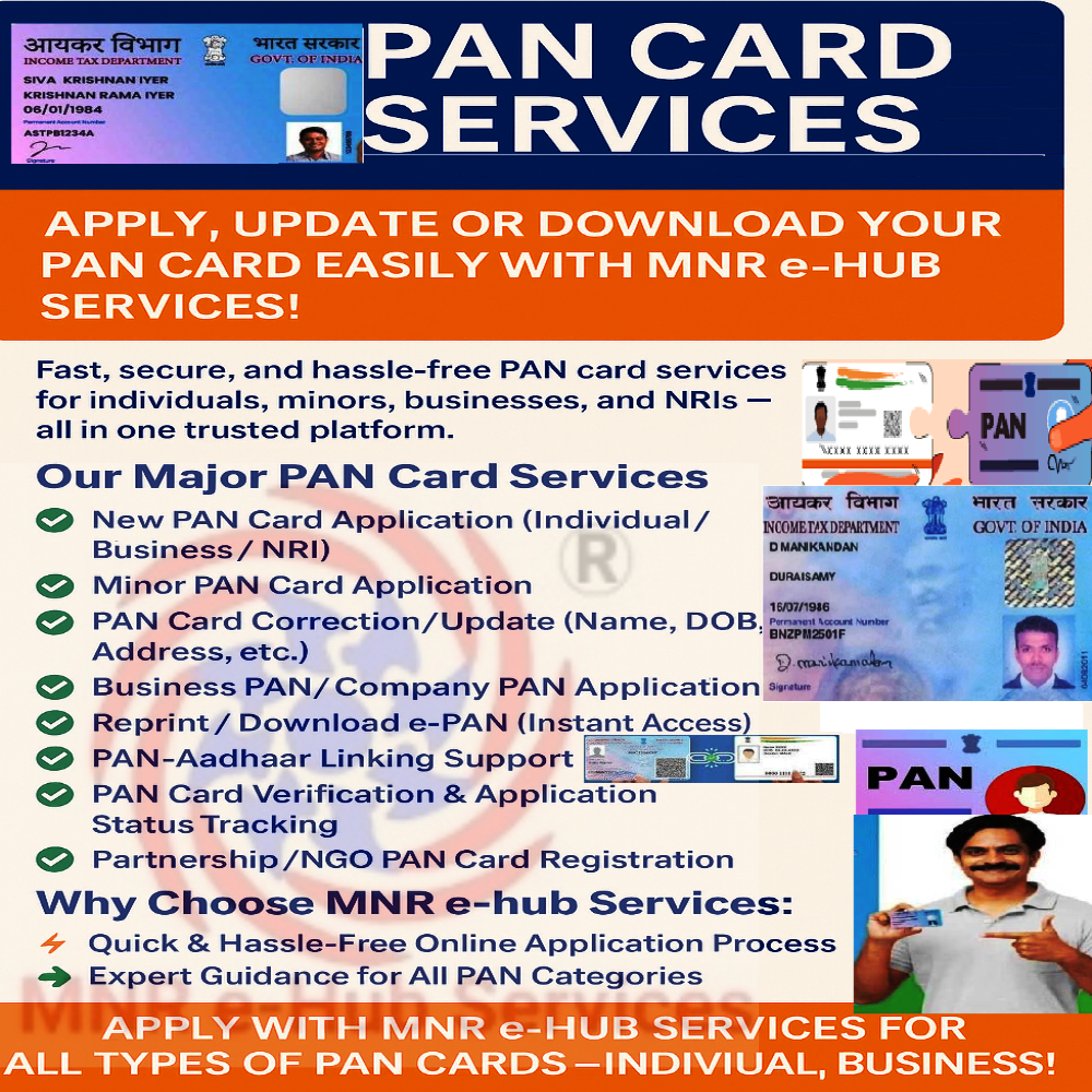 Choose “PAN Application” or “PAN Correction” → Fill applicant details → Upload scanned photo, proof of identity (POI) and proof of address (POA) → Pay service + govt fee → MNR completes online submission and sends ARN / acknowledgement.