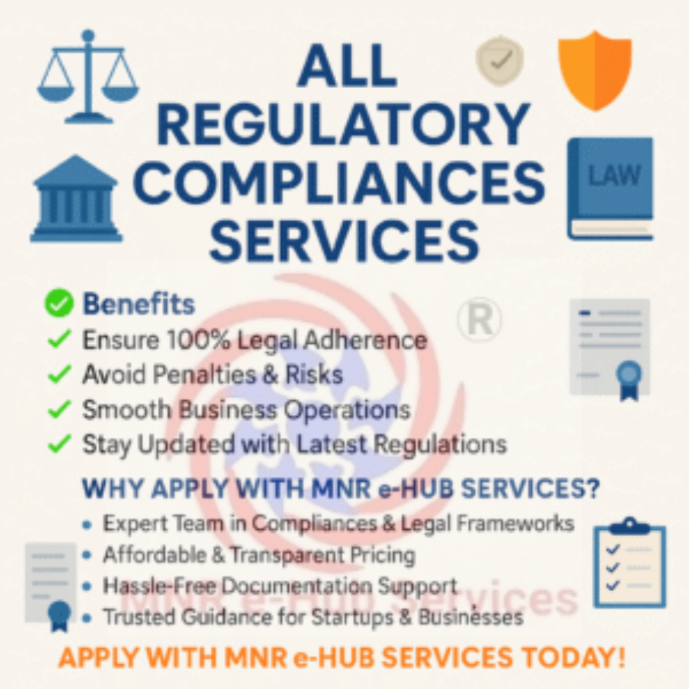 MNR e-Hub provides Regulatory Compliance Services for MSMEs and Startups, ensuring your business meets all legal, tax, and industry regulations. From registrations and licenses to GST, labour laws, and ROC filings, we help you stay compliant while you focus on growing your business.